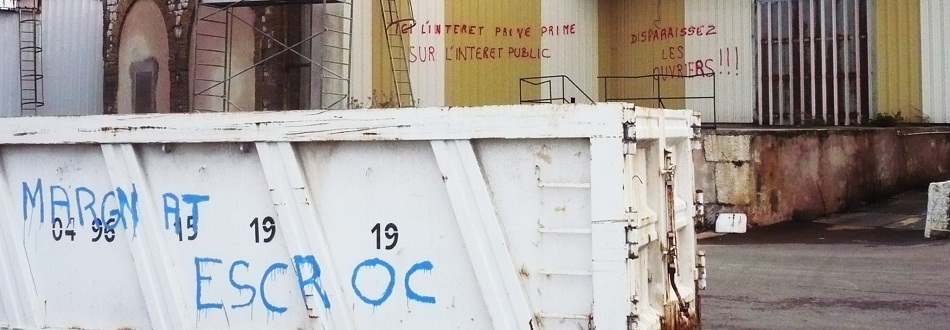 Cet été à Marseille, Legré-Mante, seule usine française d’acide tartrique, a été placée en liquidation judiciaire. Depuis, une douzaine d’ex-salariés mènent la lutte pour sauver leur emploi. Le patron, qui n’a pas conduit de plan social, s’apprête à réaliser une fructueuse opération en revendant le site. Sur les murs de l’usine, on peut lire : « Sarkozy, je ne te vois pas. »