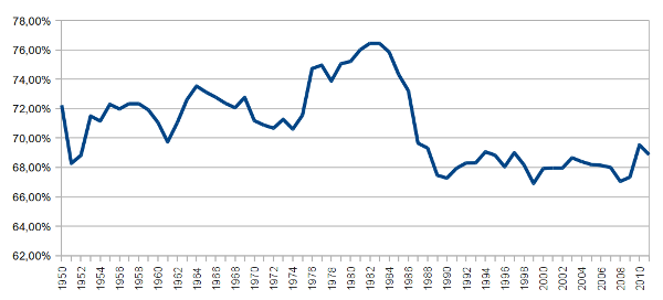 Un des thèmes récurrents du débat politique est celui de la part des salaires dans la valeur ajoutée qui a baissé entre 1982 et maintenant. En se référant aux statistiques de l’INSEE relatives aux sociétés non financières, on s’aperçoit que cette part se situait durant les trente glorieuses aux alentours de 72% pour connaître une hausse à partir de 1974 qui culminera en 1981-1982 pour chuter brutalement et évoluer à partir de 1989 aux alentours de 68%, c’est-à-dire à des niveaux inférieurs à ceux des années 1949-1972.
