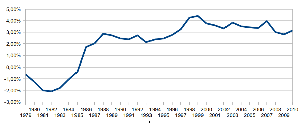 Sur la période 1979-1985, il apparaîtrait que les bénéfices des entreprises étaient globalement négatifs : cela ne signifie évidemment pas que toutes entreprises perdent de l’argent mais que les pertes des entreprises déficitaires sont plus importantes que les bénéfices des autres. Alors que cette situation préexistait avec le gouvernement de droite de Valery Giscard d’Estaing, c’est un gouvernement socialiste qui créera les conditions pour le rétablissement du taux de bénéfice à partir de 1983. A partir de 1988, ce taux évoluera ensuite dans un couloir allant de 2% à 5%.