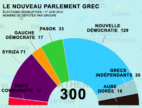 La Commission européenne et le FMI peuvent souffler : la Nouvelle démocratie (conservateurs) menée par Antonis Samaras est en tête du scrutin face à Syriza (Gauche radicale). D’après les règles électorales, le parti arrivé en tête de l’élection bénéficie d’un « bonus » de 50 sièges afin de faciliter la formation d’une majorité parlementaire. C’est ainsi que la Nouvelle démocratie et le PASOK (Parti socialiste) ont, à eux deux, une majorité de 161 sièges sur 300. La voie serait donc ouverte à la formation d’un gouvernement pro-memorandum qui appliquera les mesures d’austérité imposée par l’Union européenne et le FMI.