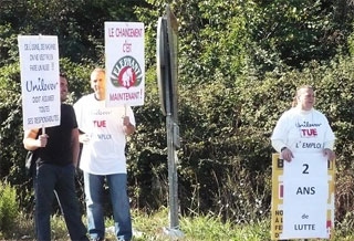 En attendant, il s’agissait ce matin de fêter les deux ans d’anniversaire de la lutte. Premier acte: distribution de tracts au rond point de la Bourbonne à l’entrée du site des Paluds. Second acte: petit meeting devant les locaux où la direction s’est retranchée depuis le début du conflit. Ce matin Angel Llovera, le directeur de Fralib n’y était pas. Sinon, les « golgots » ukrainiens qui lui servent de garde du corps depuis des mois auraient été devant la porte du bâtiment. Mais personne. Au grand regret des salariés qui souhaitaient absolument dire au-revoir à leur ex-patron qui a annoncé depuis quelques mois son départ le 30 septembre. Sur les panneaux, on pouvait lire « PDG viré, ça c’est fait« . Pour l’étape suivante, rendez-vous mercredi.