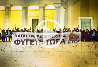 Syriza avance dans un paysage politique en ruine. La gauche traditionnelle s’est effondrée (Pasok et Parti de la Gauche démocratique), discréditée tant par la corruption qui la mine depuis des années au pouvoir, que par sa récente alliance avec la droite libérale (Nouvelle démocratie). Cette dernière agit comme courroie de transmission directe de la Troïka, au point de réduire le pays à un « protectorat » ; certains parlent même d’un « pays sous occupation ». À l’extrême-droite, le Laos (Parti du peuple) a laissé le terrain à Chryssi Avghi (Aube dorée), issu d’un groupuscule qui profite de la colère populaire poussée à son paroxysme pour la détourner à des fins ouvertement pro-nazies, et atteindre aujourd’hui la 3e place sur la scène politique.