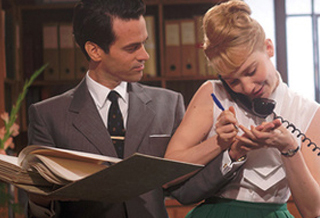 Dans le supplément féminin d’un hebdomadaire dominical, un encart publicitaire sobrement intitulé « édition spéciale » affirme qu’« à travers le parcours de son héroïne, Populaire aborde les premiers pas de l’émancipation des femmes dans la France des années 1958 ». Hum, hum… Populaire brûlot proto féministe donc ? On serait curieux de savoir ce qu’en pense Virginie Despentes… Ne serait ce que de l’affiche du film, sur laquelle Déborah François, l’actrice principale, se trouve derrière son homologue masculin, Romain Duris. Une grande marque de vernis à ongle ne s’y est pas trompée, elle, qui affirme fièrement dans les pages de cet encart co-brandé : « la gamme Colorama partage les valeurs du film et s’adresse à toutes les femmes »… Un slogan qui fleure bon les fifties, « happy days » de la condition féminine à n’en pas douter. Car peut être ne le saviez vous pas – mais Populaire est là pour nous rappeler certaines évidences d’ordre revendicationnelles de la part de ces femmes que le film prend un plaisir manifeste à nous montrer. Ainsi, « être secrétaire c’est moderne ». C’est cela…