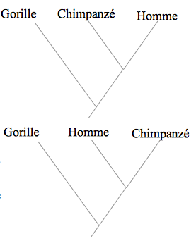 - – Le premier très traditionnel place l’homme en bout de chaîne et sous-tend le message suivant : l’homme est plus proche du chimpanzé que du gorille. A part quelques créationnistes acharnés, c’est une conclusion tout à fait admise.