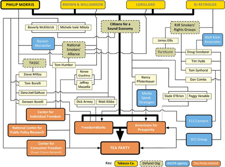 L’industrie s’allie au groupe politique fondé par les milliardaires Koch, Citizens for a Sound Economy (Citoyens pour une économie saine, CSE), qui prêche pour moins d’intervention de l’État depuis 1984. Les cigarettiers financeront CSE à hauteur d’au moins 5,3 millions de dollars entre 1991 et 2002. Ils continuent également leur campagne d’influence via les groupes de défense des droits des fumeurs. Ainsi, les adhérents des groupes de défense des droits des fumeurs du Massachusetts reçoivent un courrier en 1993 : « Les Yankees n’aiment pas les taxes injustes, rappellez-vous la Tea Party de Boston ! »
