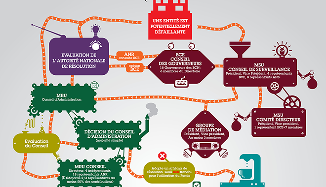 Le projet d’Union bancaire, adopté par les ministres européens de l’Économie a été débattu le 6 février au Parlement européen. Les députés ont mandaté leurs représentants pour négocier des modifications importantes avec les représentants des ministres. En l’état, le projet ne permettait pas de répondre à ses objectifs affichés, notamment celui de mettre les contribuables à l’abri des conséquences d’une éventuelle faillite bancaire (lire « Union bancaire européenne : des vessies pour des lanternes« ). Parmi les failles actuelles, le processus de décision en cas de problème, incroyablement complexe et qui laisse la main aux gouvernements alors que ce genre de décisions doit être pris rapidement de façon confidentielle, en général le week-end pendant que les marchés sont fermés. On a abouti à une véritable usine à gaz comme le montre l’infographie ci-dessous réalisée par Sven Giegold (député européen allemand, membre du groupe des Verts) que nous avons traduite.