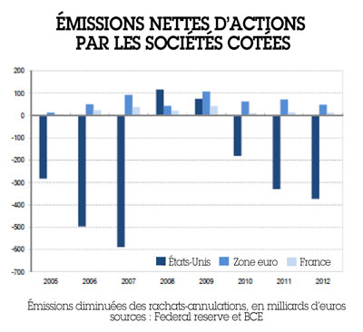 Les actionnaires des sociétés cotées ne contribuent plus au financement de ces entreprises. Aux États-Unis, depuis des années, les émissions nouvelles d’actions sont inférieures aux rachats d’actions opérés pour faire monter les cours. En France, le solde est pratiquement à zéro. Comme ces données ne tiennent pas compte des dividendes versées, la conclusion est évidente : les actionnaires opèrent un prélèvement net prédateur sur les ressources de l’entreprise, prélèvement qui n’a pas du tout pour contrepartie leur participation au financement de l’économie réelle.