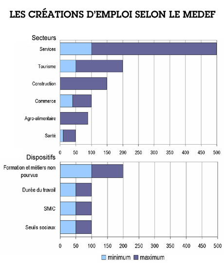 L’autre nouveauté du document du Medef est de proposer un chiffrage des mesures qu’il propose en termes de créations d’emplois. Le patronat promet la création, en cinq ans, de 690.000 à 1.590.000 emplois. Cet exercice est un énorme bluff et on ne sait pas trop comment y réagir : haussement d’épaules, dérision, protestation scandalisée ? Les chiffres sont en effet tirés du chapeau et proprement extravagants. Ils sont illustrés par le graphique ci-dessous.