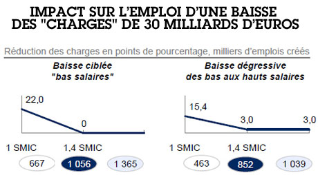 Ce calcul de coin de table est une arnaque. Il invoque deux effets. Le premier est un « effet compétitivité » : mon coût du travail baisse, je baisse mes prix, et je gagne des parts de marché, donc je crée des emplois. Mais c’est un jeu à somme nulle sur le marché intérieur, puisque ceux sur qui je vais prendre des parts de marché vont en perdre et donc supprimer des emplois. Sur le marché mondial, c’est aussi un jeu à somme nulle si les concurrents mènent la même politique de baisse des salaires. De plus, dans le cas français, la compétitivité dépend avant tout de facteurs autres que les prix. Rien ne garantit par ailleurs contre le choix d’utiliser les baisses de « charges » à autre chose que des créations d’emploi : rétablissement des marges, distribution de dividendes, etc. La meilleure preuve en a été donnée par le Medef lui-même avec son refus systématique de la moindre garantie de création d’emplois, comme contrepartie au CICE et au Pacte de responsabilité. Le Medef demande au contraire que le CICE, qui est un crédit d’impôt, soit transformé en une baisse pérenne des cotisations sociales.