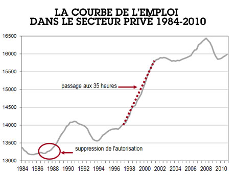 La réduction de la durée du travail a, contrairement au discours patronal, fait ses preuves. Près de deux millions d’emplois ont été créés entre 1997 et 2002, et la courbe de l’emploi (voir graphique ci-dessus) a franchi alors une spectaculaire marche d’escalier qui n’a pas été redescendue ensuite [[Voir : Michel Husson et Stéphanie Treillet, « La réduction du temps de travail : un combat central et d’actualité », ContreTemps n° 20, 2014, http://goo.gl/LKLH38 ; Michel Husson, « Unemployment, working time and financialisation: the French case », Cambridge Journal of Economics, 2013.]].