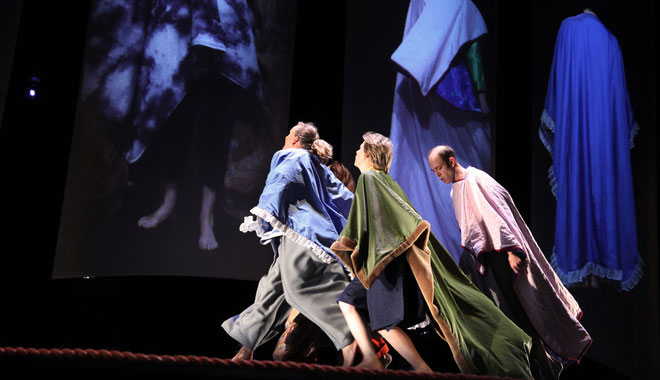 Dans la version des She She Pop, pas de vieux messieurs, mais leurs propres mères. Elles apparaissent sublimées sur de gigantesques écrans aux pieds desquels se déploient leurs filles. Pendant qu’un aspirateur est relégué en fond de scène, place aux femmes (mères et filles) qui tapent ensemble du poing, un des gestes répété du ballet du Nijinski. Le surgissement d’interviews enregistrées des mères est renversant de réalisme. « Je ne peux pas penser au sacrifice, ce serait me dissocier de mon enfant », nous dit l’une d’elles, doctoresse en médecine, n’ayant jamais exercé. « J’ai donné mes pinceaux à mon mari, c’était lui l’artiste », nous confie une autre. Au ton de la voix de cette dernière, on comprend qu’elle ne l’avait jamais révélé, certainement pas à sa fille artiste.