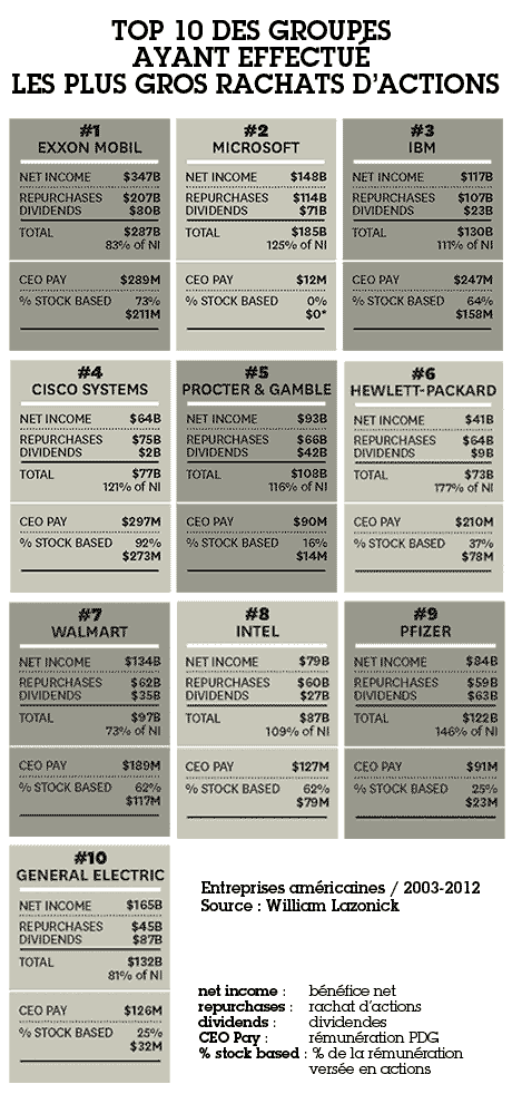 Des économistes américains ont publié récemment des études documentées sur les effets de la financiarisation et de la domination de la gestion actionnariale sur les grandes firmes des États-Unis. Parmi eux, William Lazonick, professeur et directeur du Centre pour la compétitivité industrielle de l’Université du Massachusetts et président de Réseau de recherche université-industrie, a mis en relief l’ampleur des dividendes et des rachats d’actions opérés au profit des actionnaires et des dirigeants d’entreprises largement payés en stock-options. Dans de nombreuses grandes entreprises américaines, les distributions aux actionnaires et aux dirigeants sont même supérieures aux bénéfices nets réalisés par les groupes. Cela se fait au détriment de l’innovation, de la recherche et développement, de l’emploi et des investissements productifs. Le top 10 des groupes ayant effectué les plus gros rachats d’actions établi par William Lazonick (calculs effectués sur la période 2003-2012) est tout à fait instructif.