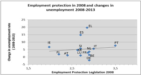 Pire, l’Allemagne, a réussi à contenir le chômage tandis que l’Espagne a vu le sien monter en flèche alors que, comme on le voit sur le graphique, la protection de l’emploi est à un niveau similaire dans les deux pays. Cherchez l’erreur.