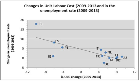 Le changement est impressionnant. Il y a toujours une corrélation, mais elle fonctionne en sens inverse. Ce que montre ce graphique est exactement le contraire de ce que veulent prouver les présidents : les réductions des coûts salariaux vont avec la hausse du chômage tandis que les augmentations de salaires vont main dans la main avec la baisse des taux de chômage. « Ce graphique raconte donc clairement l’histoire telle qu’elle s’est passée réellement dans la réalité. Il raconte l’histoire de l’échec de la stratégie de dévaluation interne des salaires générant de la récession et incapable d’entrainer un rétablissement. Il raconte aussi l’histoire de l’Allemagne où depuis 2009, la dépression des salaires et de la déréglementation a été moindre. »
