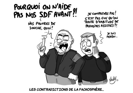 Bien sûr, les internautes de gauche, exaspérés de lire des commentaires racistes ou xénophobes, n’hésitent pas à recourir également à l’humour pour contrecarrer, ridiculiser ou pointer les contradictions de la « fachosphère » (notamment les posts appelant à se soucier, soudain, des SDF).