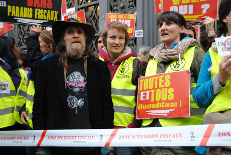 « C’est un peu David contre Goliath », résume Dominique Plihon. L’économiste et porte-parole d’Attac s’exprime au pied de l’agence centrale de la BNP Paribas, dans le 9e arrondissement de Paris. En cette matinée du 3 décembre, l’immeuble est fermé « pour cause d’évasion fiscale », annonce une affiche installée sur les barreaux métalliques de la grande porte. Environ 250 personnes, équipées de badges, pancartes et banderoles frappés de slogans comme « Qui vole qui ? », barrent l’entrée du bâtiment. Les journalistes sont nombreux, les policiers aussi. Ces derniers ceinturent le rassemblement, mais gardent leurs distances. Ils n’interviendront pas.
