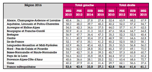 3. Si la gauche progresse sur 2014, ce n’est donc pas parce que la gauche critique lui a donné de l’élan. Au contraire. Quel que soit le résultat enregistré, que l’on inclut ou non dans les scores du Front de gauche ceux des listes de large union de PACA et de Languedoc-Roussillon-Midi-Pyrénées, le résultat (entre 4,1% et 5,7%) est en retrait à la fois sur la précédente consultation régionale et sur le scrutin européen de 2014.