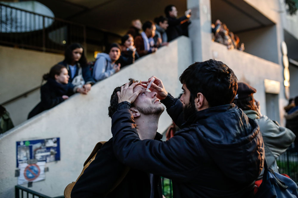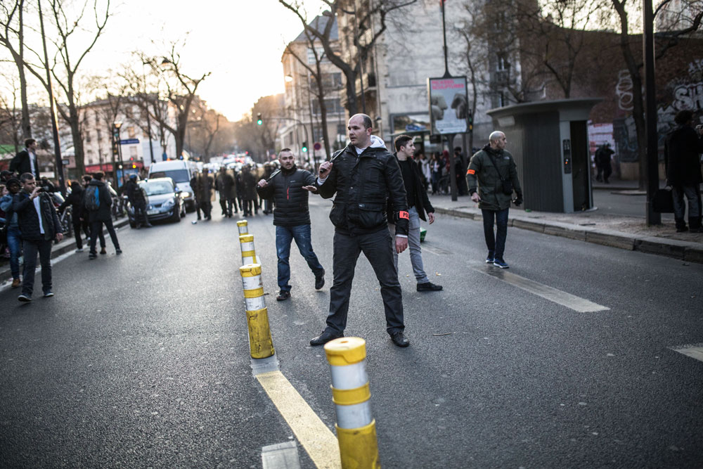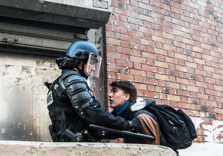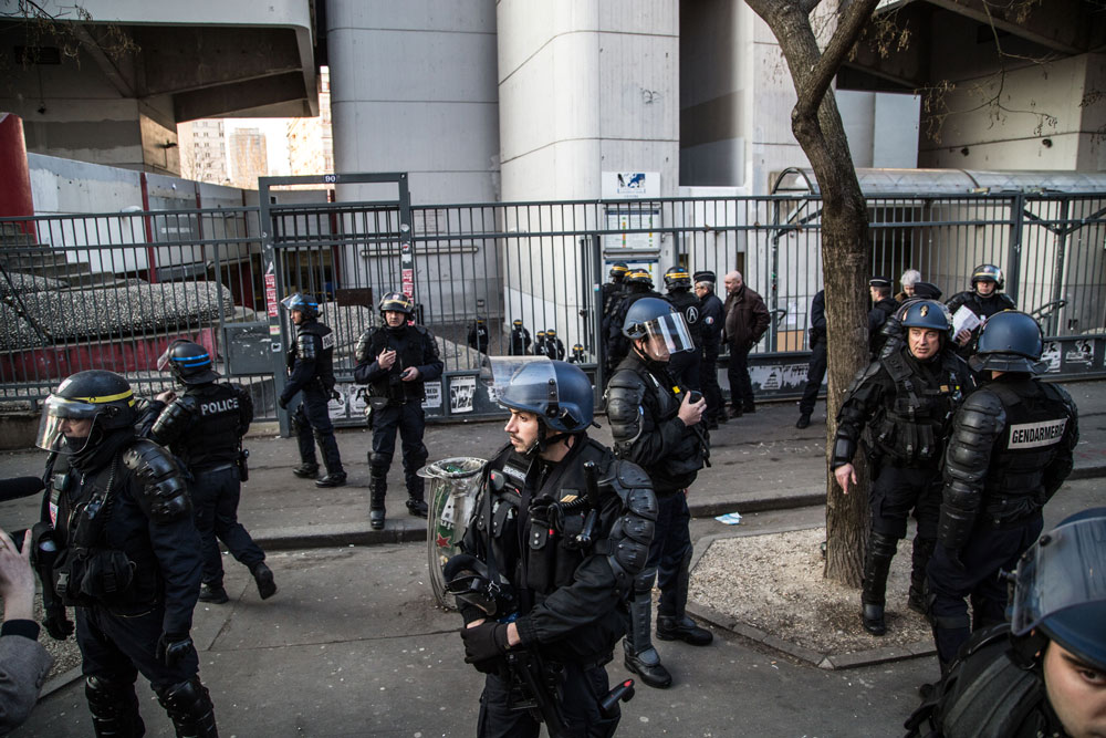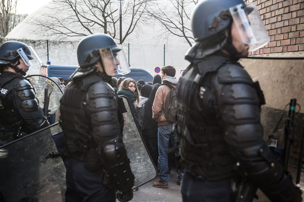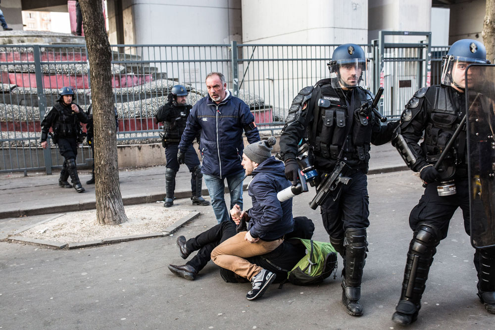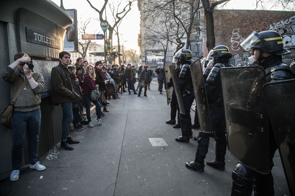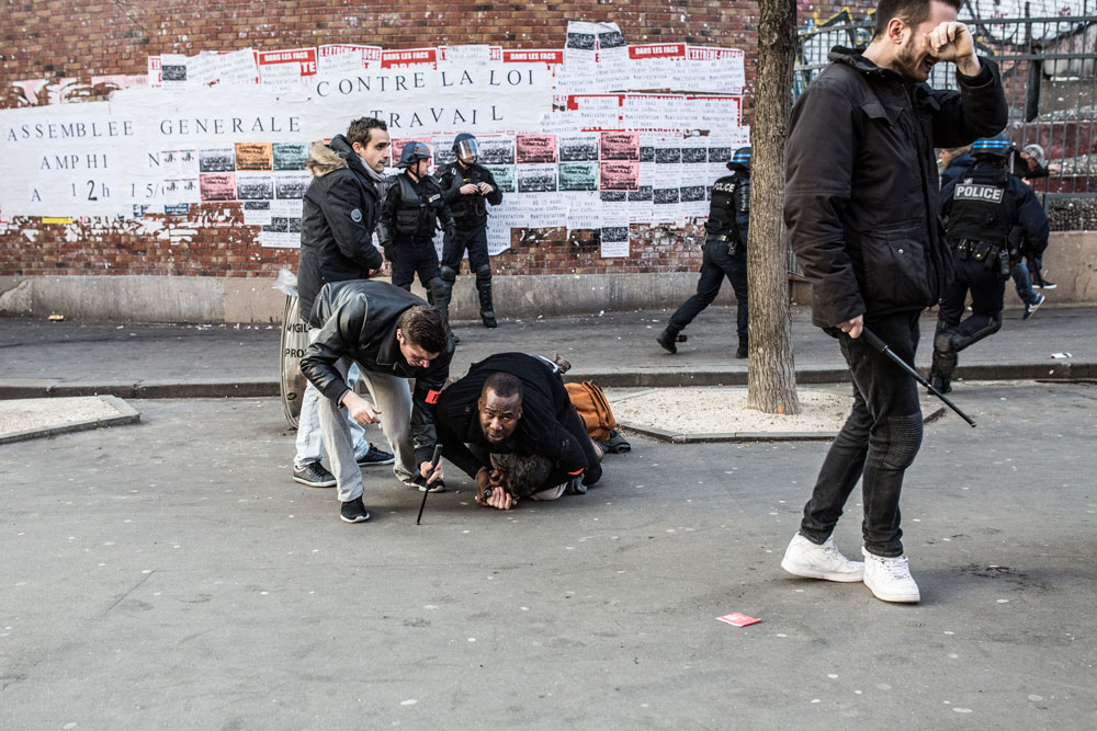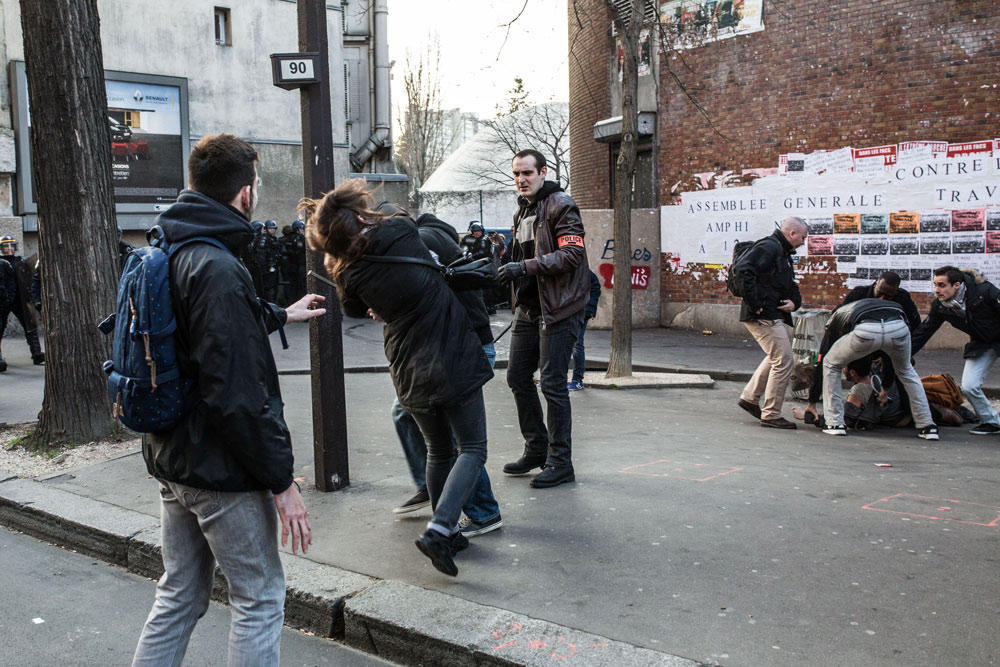 Vers 17h, des étudiants et des manifestants affluent malgré tout aux abords du site de Tolbiac. Plusieurs dizaines de cars de CRS stationnent dans le quartier. Un dialogue s’installe entre un responsable de l’université, entouré de vigiles, et quelques étudiants à travers les grilles. Échanges courtois, incompréhension totale. Chacun campe sur ses positions. Un groupe de plusieurs dizaines d’étudiants, entrés sans effraction, arrivent finalement à occuper un amphithéâtre pendant une vingtaine de minutes pour tenir leur AG. Les CRS interviennent et évacuent les étudiants. Une fois à l’extérieur, les jeunes sont encerclés par les forces de l’ordre pour les faire monter dans des fourgons. C’est alors qu’un groupe force le passage et parvient à s’enfuir. Panique générale. Les coups pleuvent de la part de policiers en civils et de CRS. Des arrestations musclées ont lieu. Des interpellés saignent. Matraquage, menottes, lacrymo…