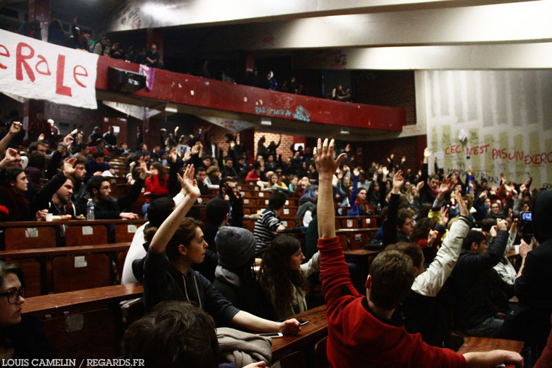 À voir aussi ci-dessous, un portfolio des mobilisations à Paris 1 Tolbiac : la dernière assemblée générale avant la manifestation ‘photos Louis Camelin).