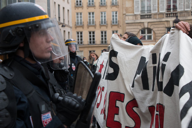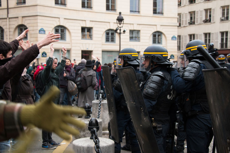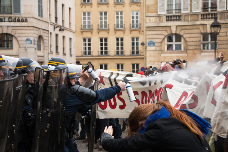 Si les attaques policières n’ont pas suffi pas à entamer la motivation d’une partie des présents, restés pour tenir l’assemblée générale et soutenir les occupants de l’Odéon, elles frappent par leur violence. Et par le fait qu’elles constituent l’unique réponse aux actions menées. Participant à la manifestation, Julien, metteur en scène, pointe l’un des paradoxes de la situation en relevant que « cette violence policière est d’autant plus désespérante qu’elle se produit devant l’un des six théâtres nationaux de France ». Et souligne la symbolique particulière du lieu :