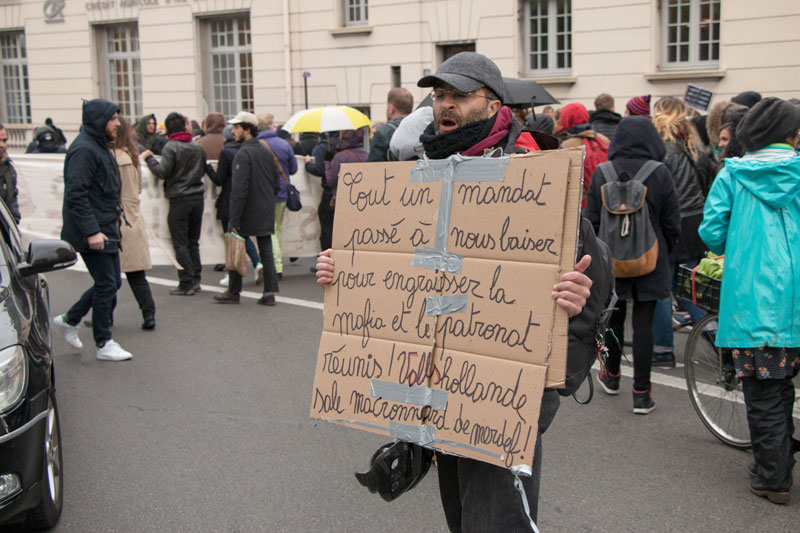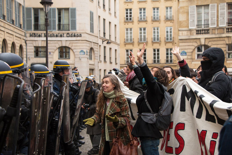 Lorsque le cortège arrive devant le théâtre, d’autres manifestants sont déjà là. D’autres, encore, les rejoignent, venant de République notamment, le mouvement Nuit debout ayant décidé de délocaliser son assemblée générale de la place de la République à l’Odéon. Il y a là des artistes, des techniciens ou des personnels administratifs de structures culturelles, intermittents ou permanents, des étudiants, des membres d’Hôpital debout – aisément repérable à leur blouse blanche. D’autres personnes, encore, moins engagées mais se sentant tout aussi concernées. Parmi celles-ci, Bérangère, graphiste free-lance, présente « par solidarité :