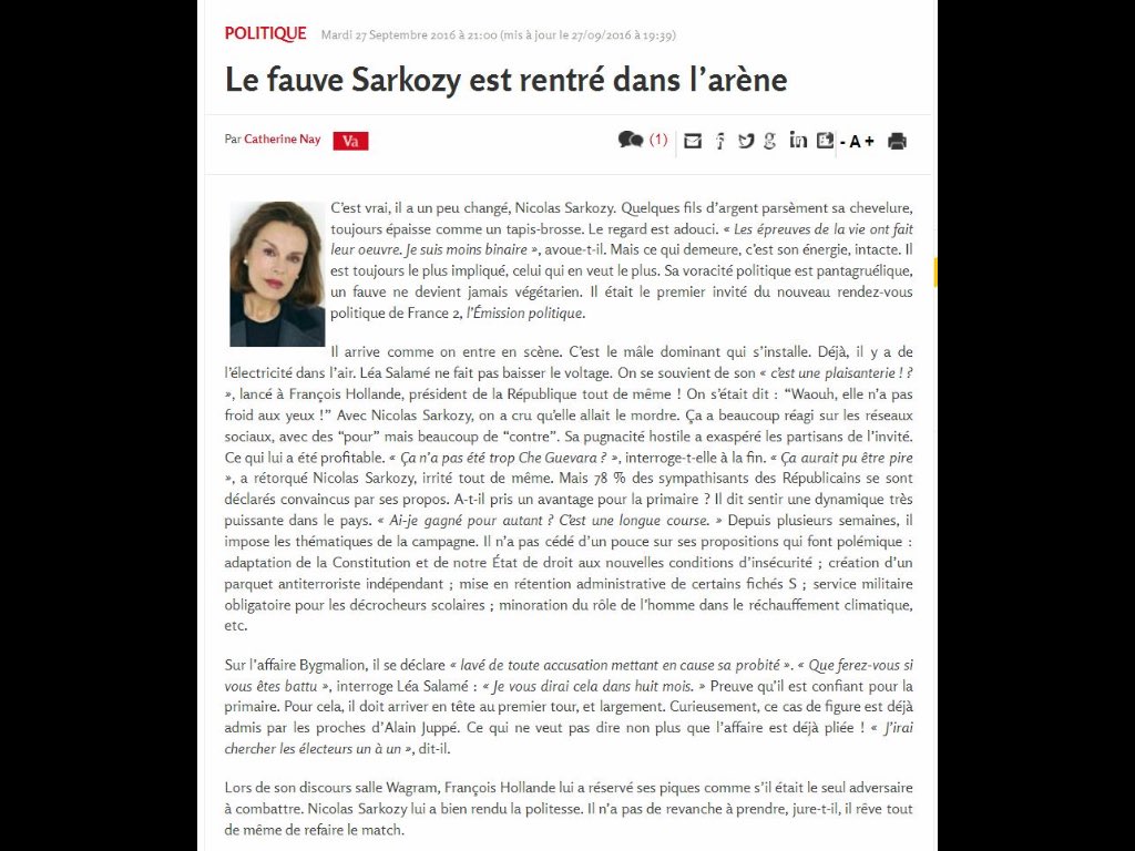 Nicolas Sarkozy a donc encore plein d’ennuis. De vieux ennuis, qui remontent à la surface comme des corps mal lestés. Coup sur coup, un Envoyé Spécial sur Bygmalion, le livre de Patrick Buisson et les carnets de Choukri Ghanem. Ce n’est pas très charitable de contrarier sa campagne 2017 avec celles de 2007 et 2012 : un homme qui a si souvent « changé » ne devrait pas être tenu responsable de ses agissements passés. Heureusement, il a encore des défenseurs invétérés. Comme Catherine Nay, qui a une méthode simple : elle ne veut rien savoir. L’éditorialiste, deux jours auparavant, avait signé une chronique extatique sur le retour du « fauve Sarkozy ».