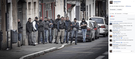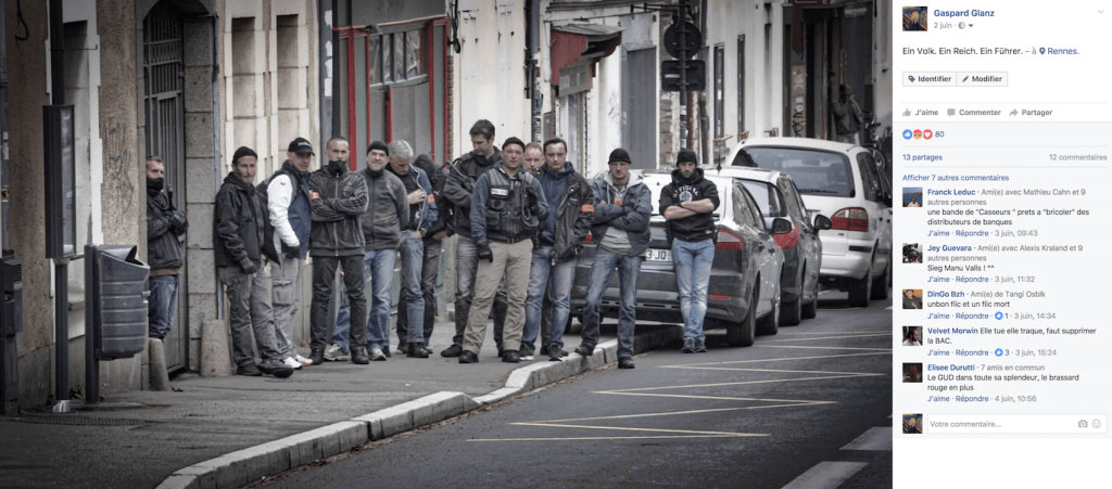 Mais ce n’est pas tout : une seconde citation à comparaître a été signifiée au journaliste[[Pour cette affaire, l’audience est prévue le 16 Janvier 2017 au tribunal de grande instance de Rennes.]]. Il est cette fois accusé d’injure publique envers douze policiers, suite à une image prise à Rennes pendant une manifestation contre la loi travail, et postée sur un réseau social accompagnée du commentaire « Ein Volk, en Reich, ein Führer », slogan utilisé dans les années 30 par le parti nazi [cliquez sur l’image ci-dessous pour l’agrandir]. « Je rappelle qu’il existe un truc qui s’appelle la liberté d’expression, et que des magazines comme Charlie Hebdo pour ne citer que le plus illustratif, on fait bien pire que ça », se défend Gaspard Glanz. L’outrance n’est-elle pas le propre de la caricature, à même d’alerter sur les excès du pouvoir ?